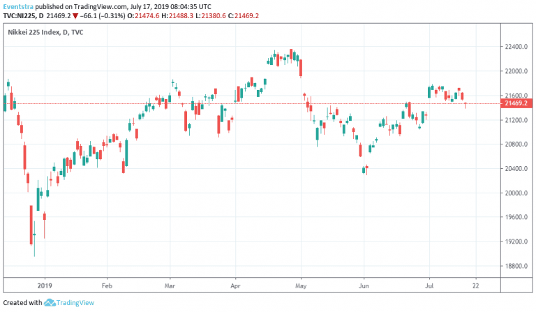 Asian indices finished lower as investors worried from Trump’s comments that he could impose more tariffs on China if he wanted to. The Hang Seng finished 0.15 percent lower at 28,581, the Shanghai composite ended 0.20 percent higher to 2,931 and the Singapore Straits Times index finished 0.01 percent lower at 3,359. Aussie stocks ended 0.49 percent higher at 6673 after the Australia Westpac Leading Index, month over month, declined to -0.1% in June from previous reading of -0.08%. The Westpac Leading Index, month over month, came in at -0.08% for June. In Japan the main benchmark, Nikkei 225 finished 0.31 percent lower at 21,469. Earlier the Fitch Ratings agency affirmed Japan’s Long-Term Foreign Currency Issuer Default Rating at ‘A’ with a stable outlook. Nikkei positive momentum is intact and trades close to two month high.