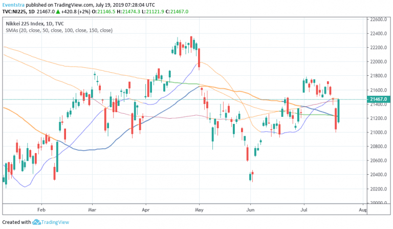 Asian indices and Nikkei finished higher as stock investors cheered dovish comments from New York Fed President John Williams and strong earnings from Microsoft. The Hang Seng finished 1.06 percent higher at 28,7628, the Shanghai composite ended 0.78 percent higher to 2,923 and the Singapore Straits Times index finished 0.36 percent higher at 3,372. Aussie stocks ended 0.80 percent higher at 6,700. In Japan the main benchmark, Nikkei 225 outperformed as it finished 2.00 percent higher at 21,466. Japan May all industry activity index registered at +0.3% versus +0.3% m/m expected while the Japan National Consumer Price Index (year over year) matched forecasts of 0.7% in June. The move today by the Nikkei regenerated the positive momentum and an attempt to 21,700 looks possible.