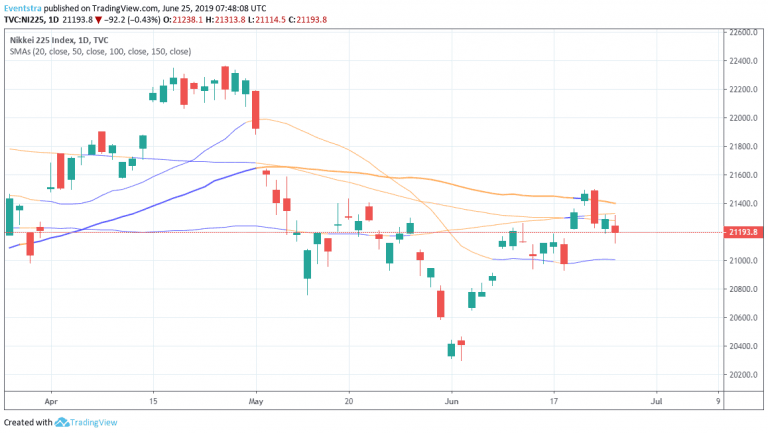 - The Japanese Nikkei 225 benchmark trades lower today at 21,176 amid geopolitical concerns and as traders await the G20 Summit in Osaka, Japan