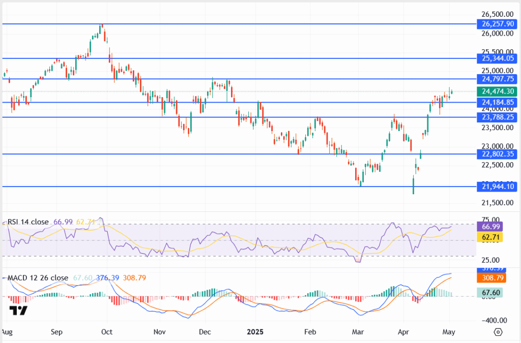 Momentum indicators are leaning bullish, but the index is still over 1,800 points away from its all-time high. A clean breakout and close above 24,600 will be needed to signal strength. For now, it’s still range-bound, but the pressure is building.