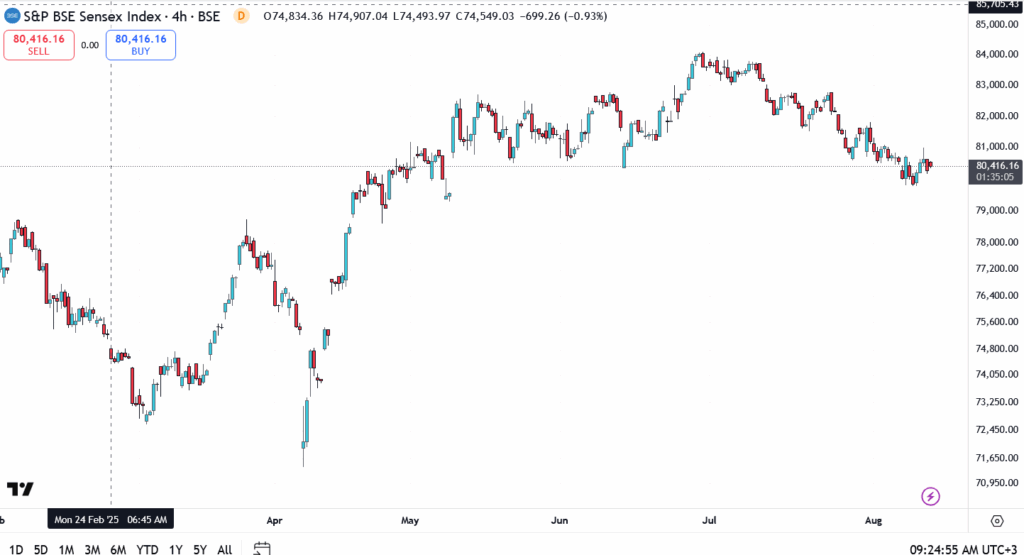 The index was hovering near 80,420 during mid-morning trade, holding comfortably above its near-term pivot at 80,100. The market has defended this area for three straight sessions, a sign that buyers are willing to step in on minor pullbacks.
