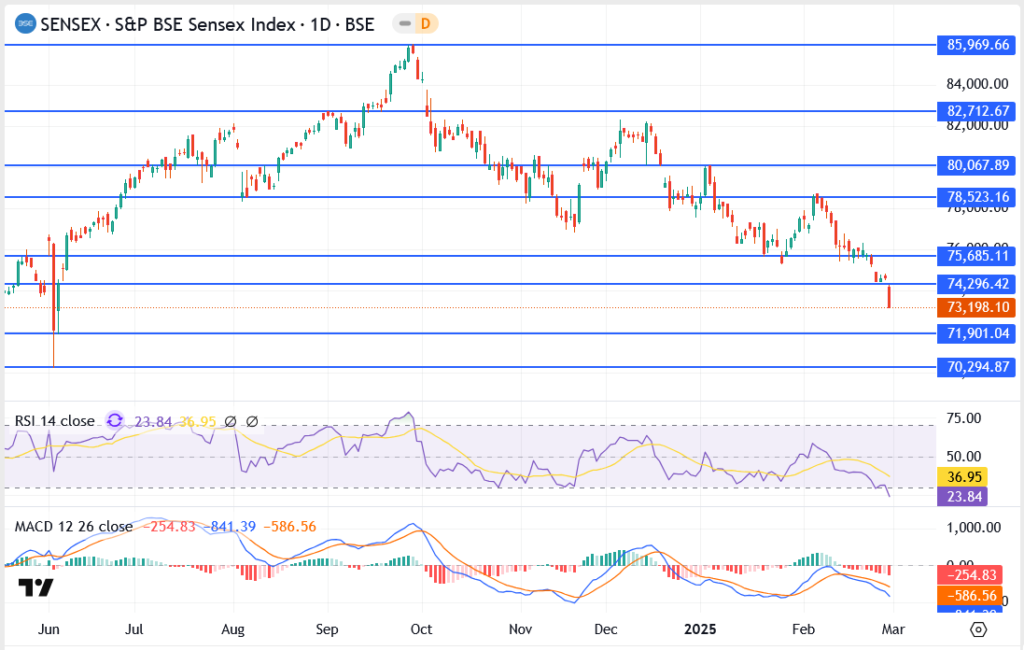 The S&P BSE Sensex has witnessed a sharp decline, falling below the 74,000 mark. Persistent selling pressure across key sectors has intensified, raising concerns with further downside movement seeming highly likely. The big question remains: Is this a buying opportunity or will the downturn continue?