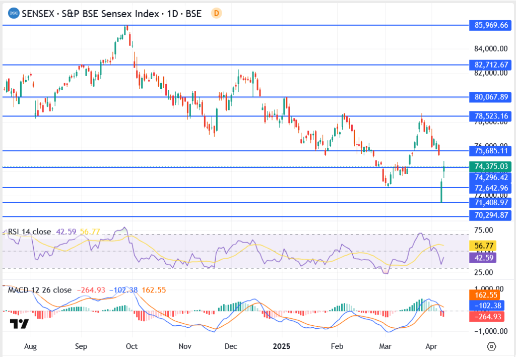 - Sensex rebounds above 74,300 after tariff-driven selloff, but bearish momentum persists. Resistance at 75,685 remains the key level to watch.