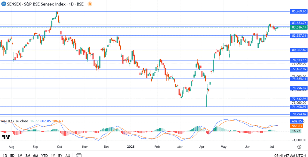The BSE Sensex held firm around 83,536.14 on Monday’s close, managing to stay in positive territory despite global headwinds and chatter around a possible Bharat Bandh on July 9. The index is now pressing just below 83,683, a key resistance zone that has capped the last few rallies.