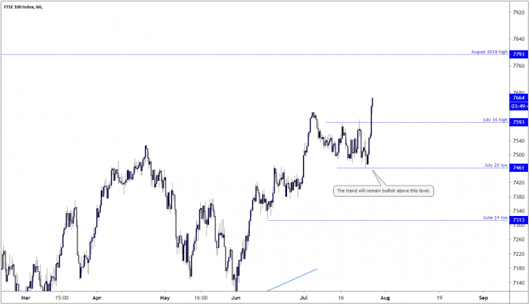 As for the technical outlook, the FTSE 100 trend is once again bullish as the price took out the July 16 high of 7642, a level we pointed out as important in my July 22 update: FTSE 100 Remains Capped By July 16 High.”