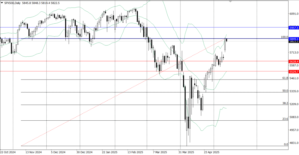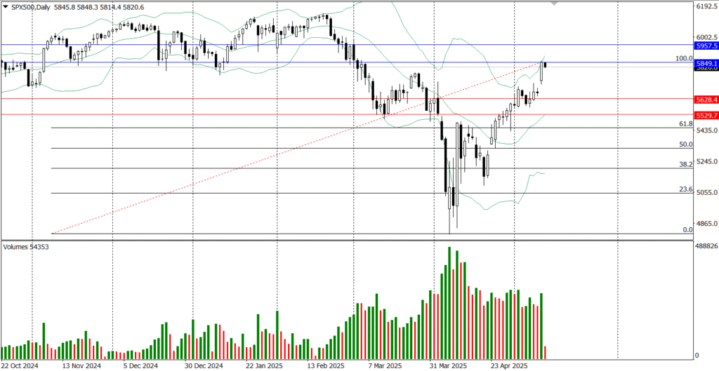 At the time of writing, the S&P500 is holding under the pressure of the strong resistance level at $5849.1, any breakout above this level may open the door for the index to reach higher levels and confirming the bullish scenario.
