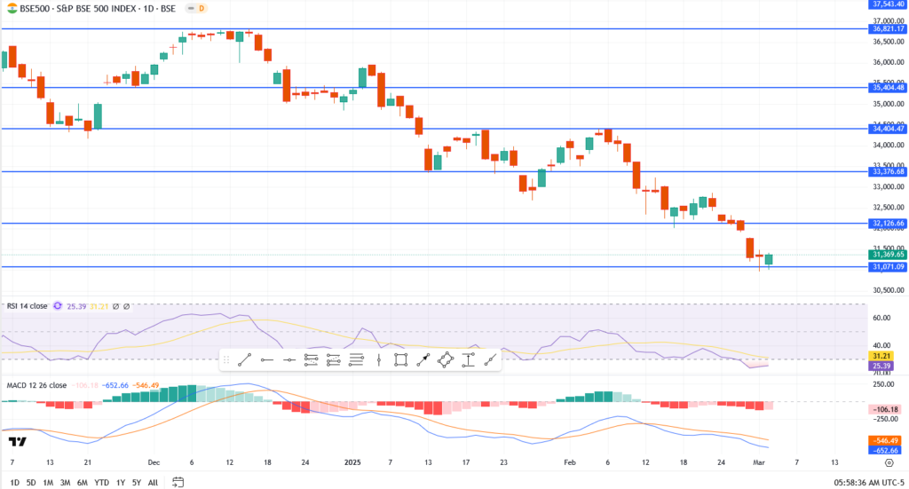 Given the technical indicators and price action, the BSE 500 index remains in a downtrend. The market will require a strong catalyst to break through resistance levels and reverse the bearish momentum. Traders should closely watch the 31,071.09 support level—if breached, further downside toward 30,500.00 is likely. On the upside, a move above 32,126.66 may provide temporary relief. Until a clear trend shift is confirmed, caution is advised when making long-term bullish bets.