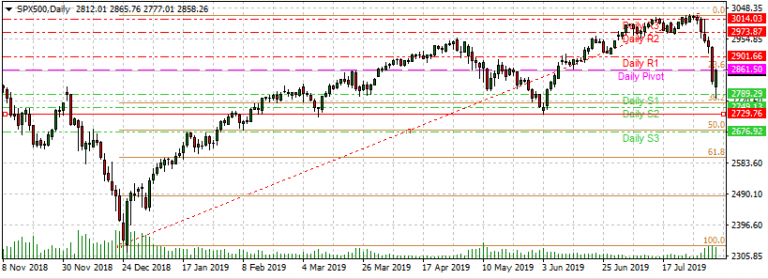 Having bounced off yesterday’s low of 2777 at the 38.2% Fibonacci retracement traced from the swing low of December 26, 2018 at 2315 and the July 29 swing high of 3026, the S&P 500 Index futures are now trading at 2861.50. This is the central pivot price level and also the price level of the 23.6% Fibonacci retracement.