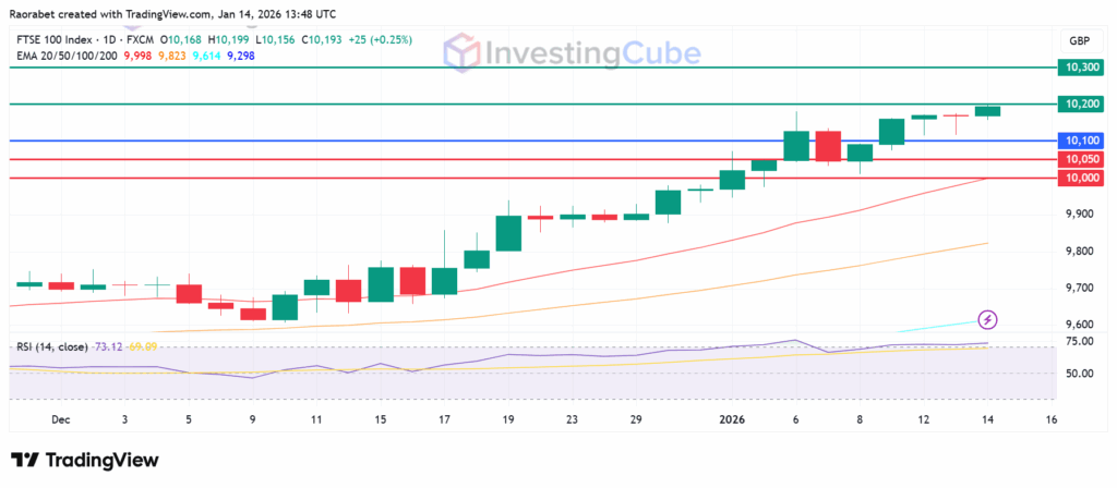 FTSE 100 Index on January 14,2026 with support and resistance levels. Created on TradingView