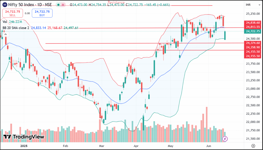 From the technical perspective, the Nifty 50 index opened today on a gap and declined from 24,813 yesterday’s close to open around 24,472. The index remains under pressure from the geopolitical tensions between Iran and Israel.