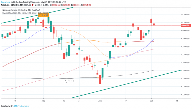 Wall Street indices erased early gains and turn lower with the Dow Jones currently trading -0.07% lower at 26,699. The S&P 500 is little changed at 2,963, while the Nasdaq gives up 0.11% at 8,082 as the initial optimism following the US – China trade truce faded and President Trump now sets his sights on Europe. The Office of Trade proposed a list of additional products for tariff countermeasures that covers an estimated $4B, including, cheese, whiskeys and wines. The United States ISM-New York Business Conditions Index increased from 48.6 to 50 in June. The IBD/TIPP Economic Optimism, Month over Month, increased to 56.6 in July from previous 53.2 also the United States Redbook Index, Year over Year, climbed from previous 5% to 5.5% in June 24.