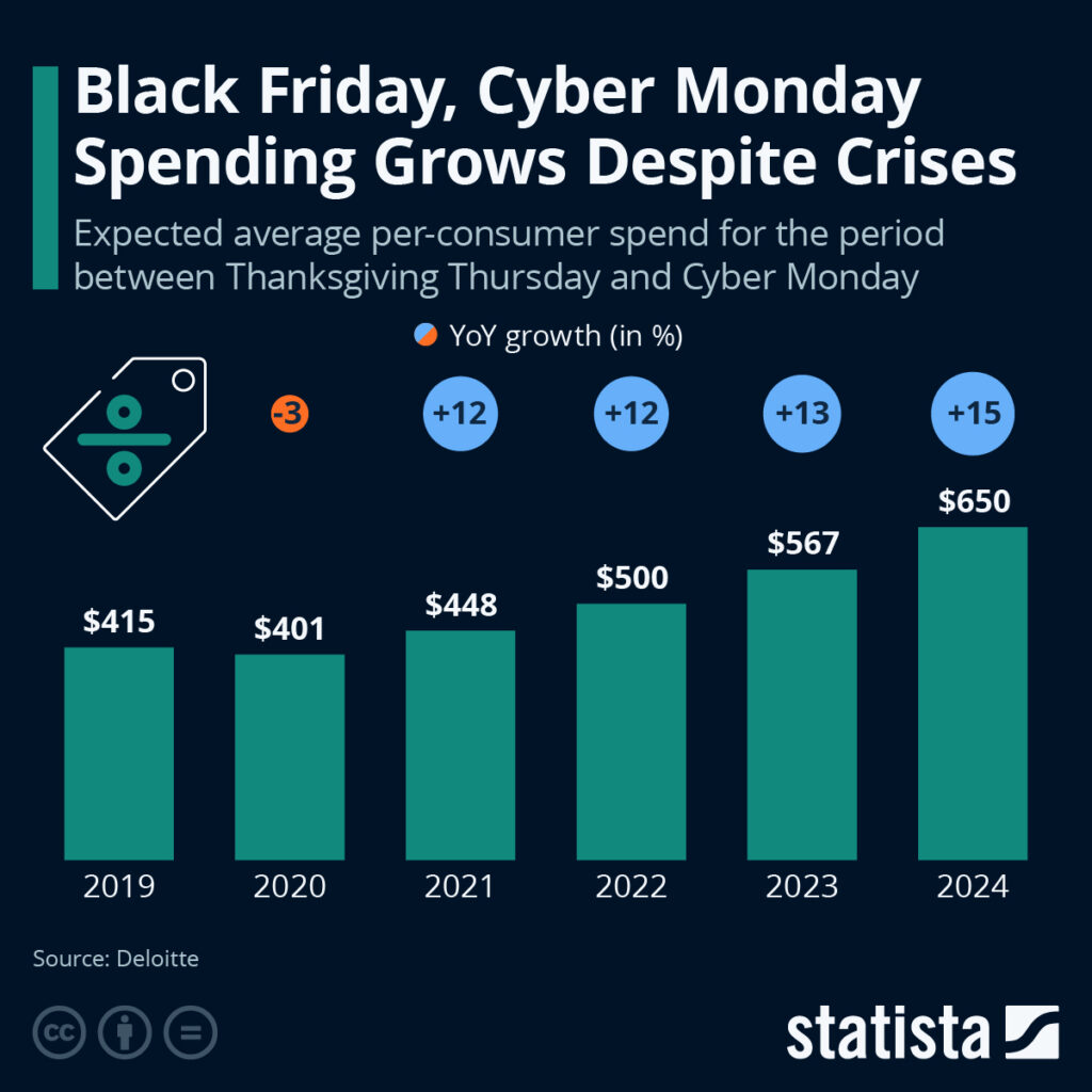 Black Friday spending has grown year over year since it began. Consumers spend more on Thanksgiving Thursday and Black Friday than usual. According to the Deloitte Black Friday-Cyber Monday survey: