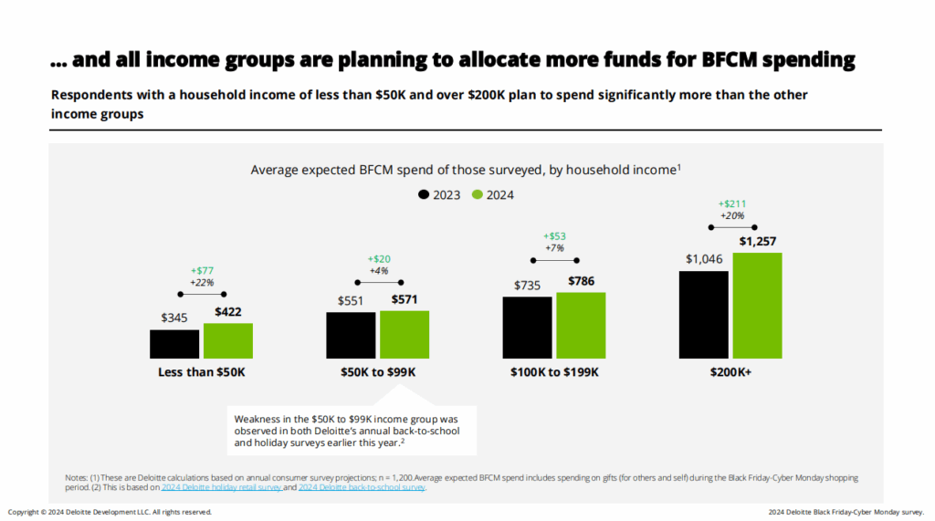 People with lower incomes were planning to spend more in 2024, which means that they were feeling more confident or eager to take advantage of good deals. On the other hand, those with higher incomes were still the biggest spenders overall, played a major role in driving holiday sales.