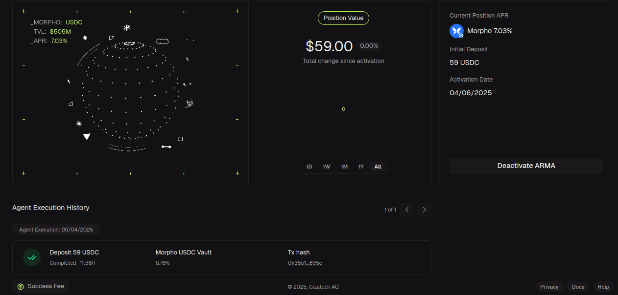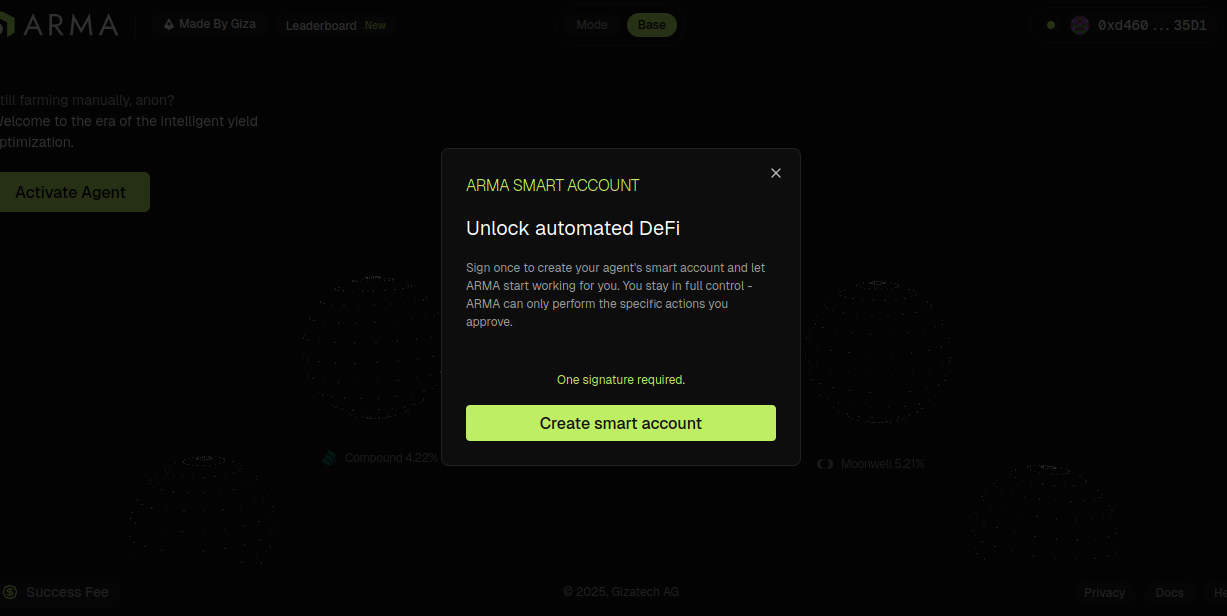 Your smart account will be automatically set up and configured to delegate protocol interactions to the ARMA agent. It will utilize your existing wallet to securely sign transactions. All that’s required is a single click to confirm, and ARMA will have all of the required approvals to start automating yield farming on your behalf. Doing so will authorize the transfer of your funds to your secure smart account. It will also create a one-time session key for ARMA to get started in its yield optimization operations. Your ARMA agent is now active.