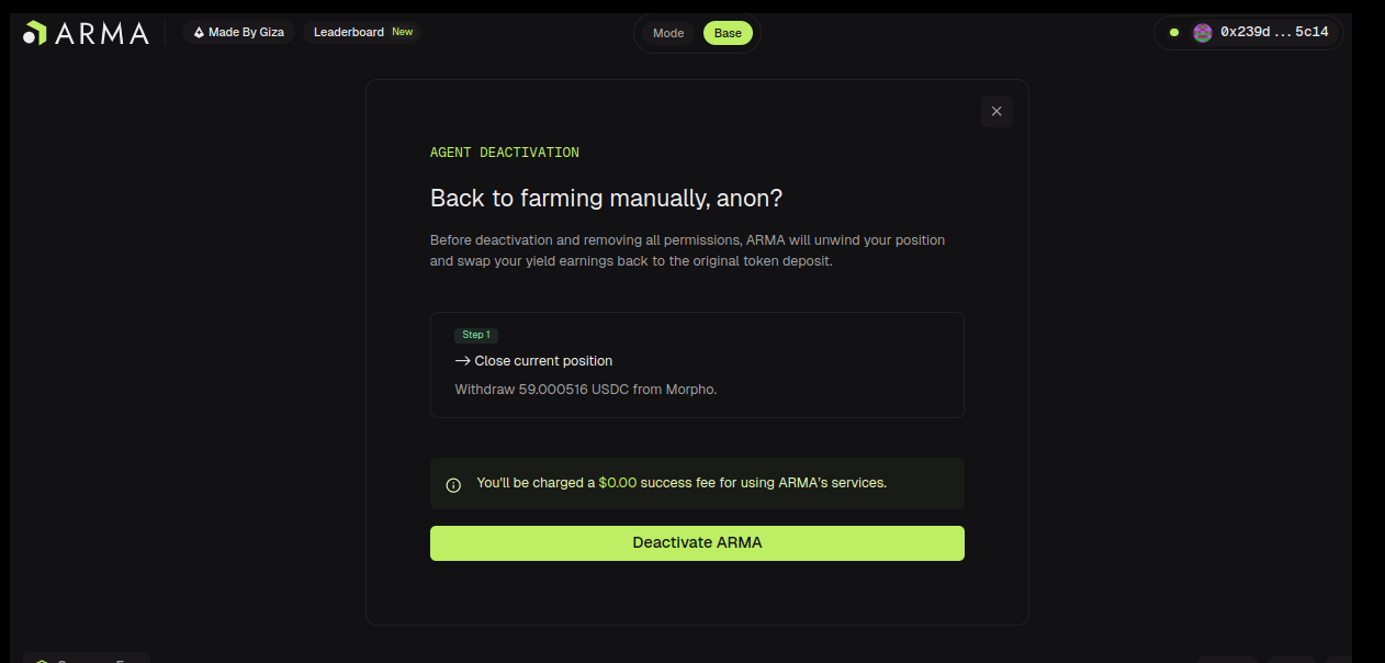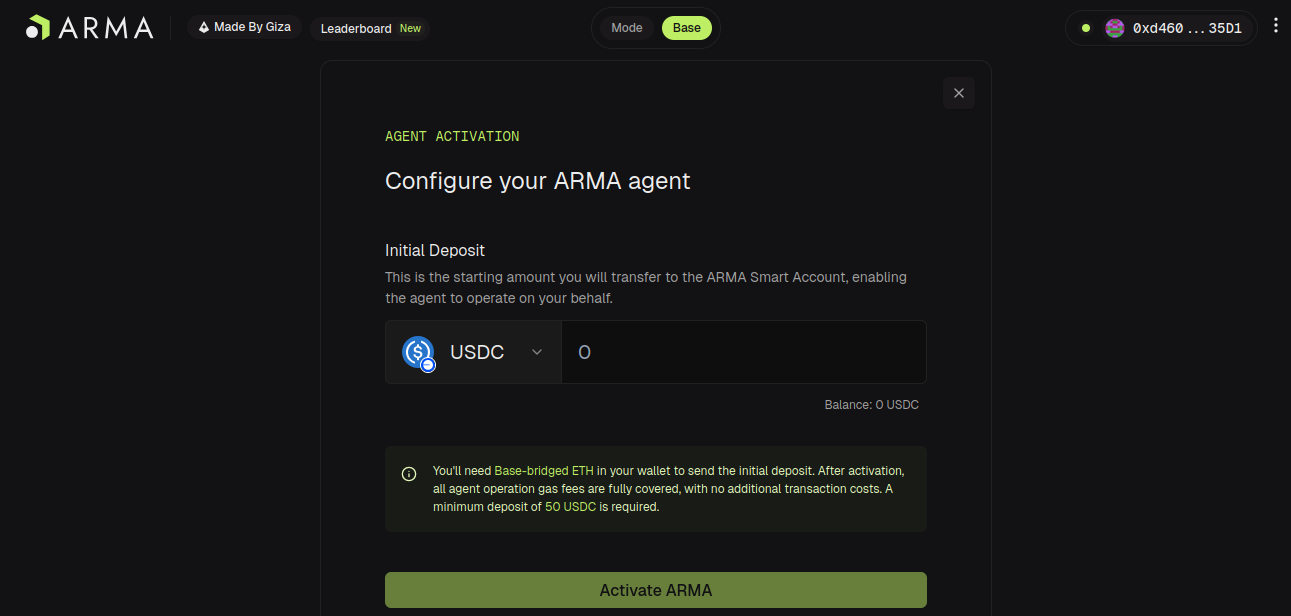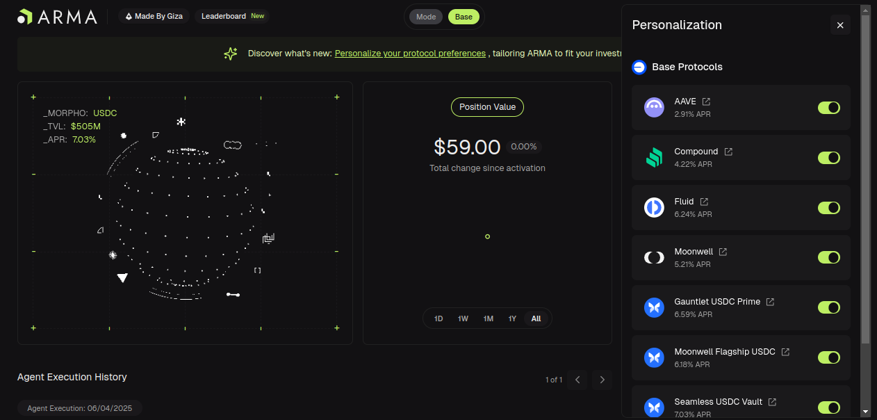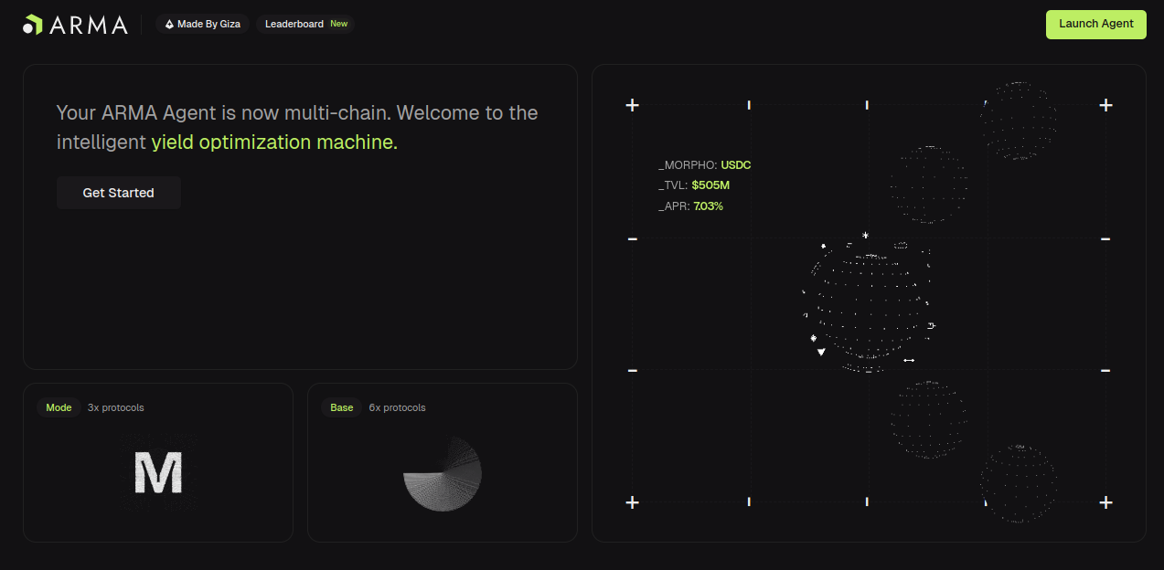 For the purposes of this guide, we’re going to be using Giza’s ARMA, which is described as an autonomous yield-optimization agent that’s focused on maximizing profits across stablecoin deposits across the Base and Mode Network blockchain’s most widely used protocols.