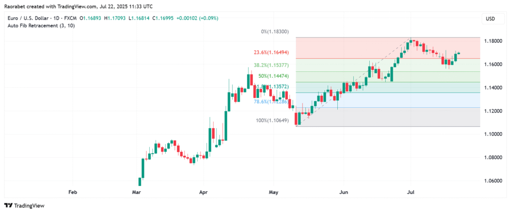 On the chart above, the recent bounce toward 1.1649 (23.6%) suggests that price is attempting to resume the upward trend, but traders should watch this level closely for potential resistance. The 23.6% retracement level (1.1649) held briefly as a support zone during the initial pullback from 1.1830. However, the price eventually broke below it, indicating that bullish momentum was weakening. After the drop, the currency pair has recently bounced back up, and it’s now acting as resistance.
