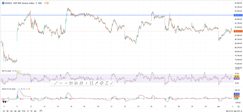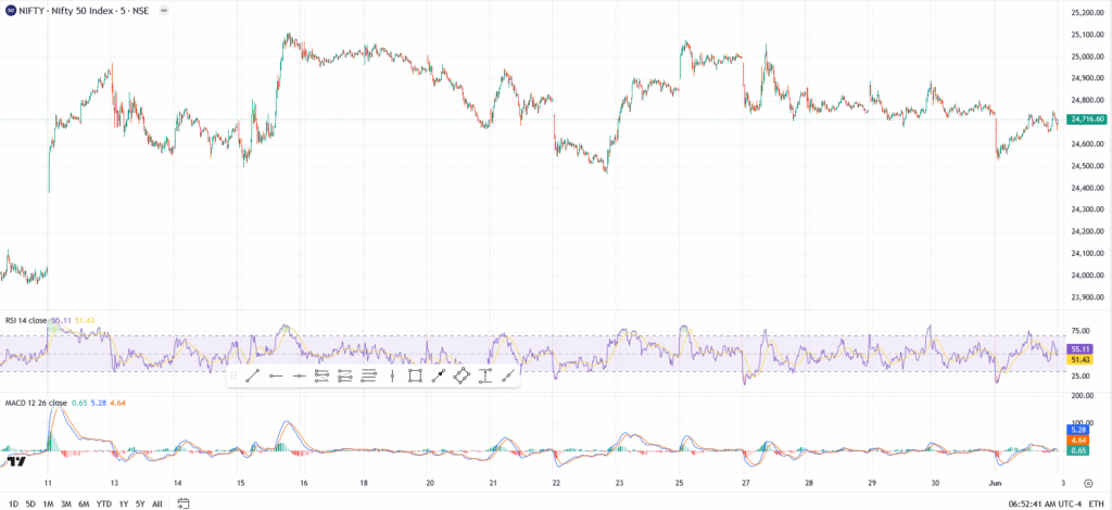 Over at the NSE, the Nifty 50 dipped to 24,716.60, after briefly touching levels below 24,550. That zone has become a frequent battleground for bulls and bears. With the RSI barely holding at 51 and the MACD offering little direction, the index looks like it’s waiting on a catalyst, or perhaps more bad news.
