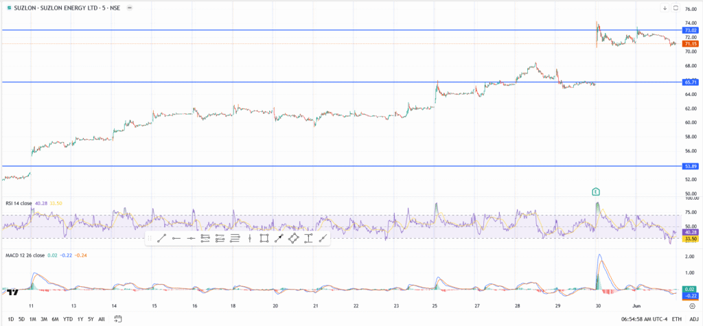 Technically, the stock cleared ₹65.70, and it hasn’t looked back. With decent volume, the next resistance stands around ₹73.00, followed by ₹76.50 if bulls stay active. RSI is in the low 40s, giving it space to move. MACD is flat, but momentum is still leaning positive.