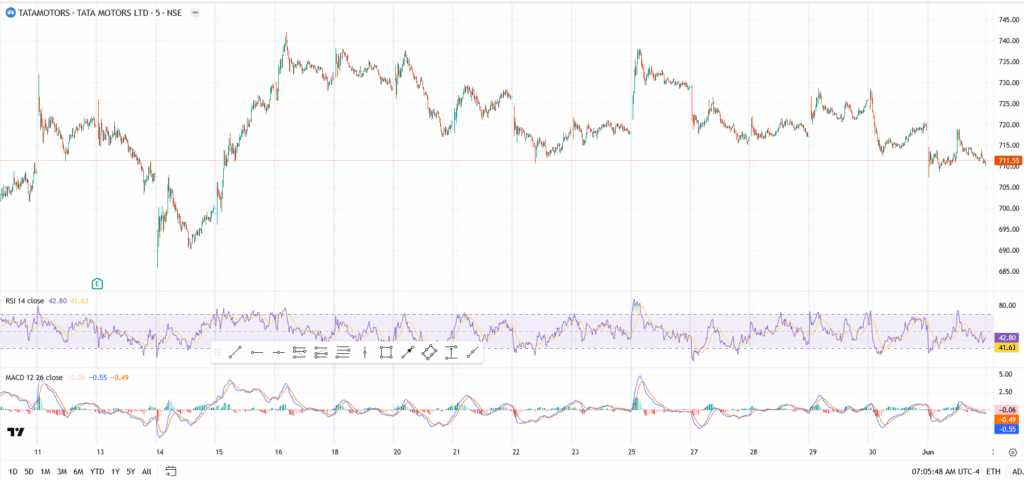 The stock ended the session near ₹710, and if it breaks below ₹705, the chart starts to look shaky. RSI is down to 42, and the MACD is curling south. The next support sits closer to ₹690, and traders are watching that level closely.
