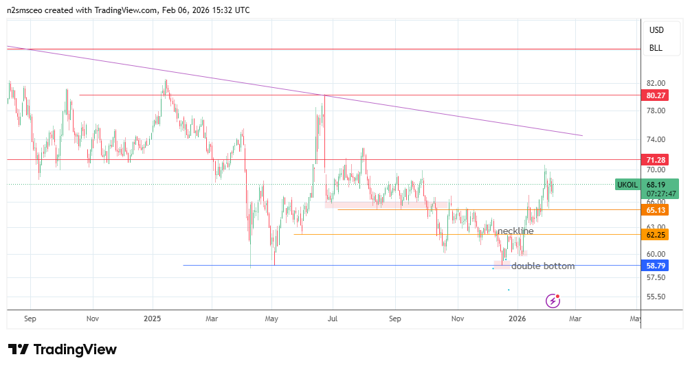 Figure 2: Brent crude daily chart showing key price levels (snapshot taken on 6 February 2026)