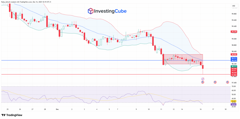 Before the data release, the Dollar Index had been consolidating above 98.15. Once the data was released, sellers took control, pushing the price below the lower Bollinger Band at 98.12. The bearish momentum drove the price down to a low of 97.86 as an immediate reaction.