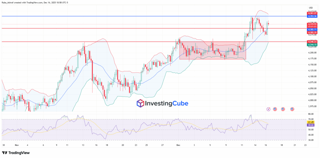 The price action shows the recent breaking above a consolidation range around 4,175-4,245 and touching the upper Bollinger band near 4,361, signaling bullish momentum with limited upside. The support lies around 4,302- 4,246, while the resistance is near 4,353-4,361.