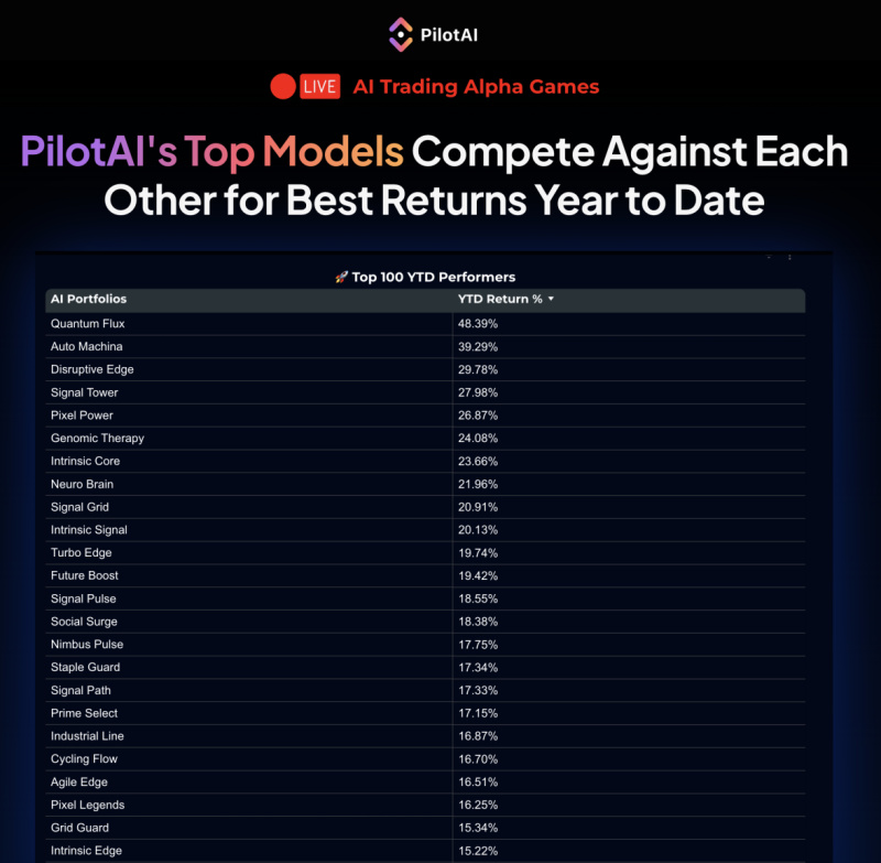 PilotAI today announced “Alpha Games,” a public, ongoing competition among the company’s AI-driven portfolio models, showcased on the AI Leaderboard at https://www.pilotai.com/ai-leaderboard. The initiative presents a clear, daily-refreshed view of how strategies rank by return and risk-adjusted measures, giving investors a simple way to observe model behavior over time. Visitors can also create a free account to test any strategy in a paper-trading portfolio with live market data.