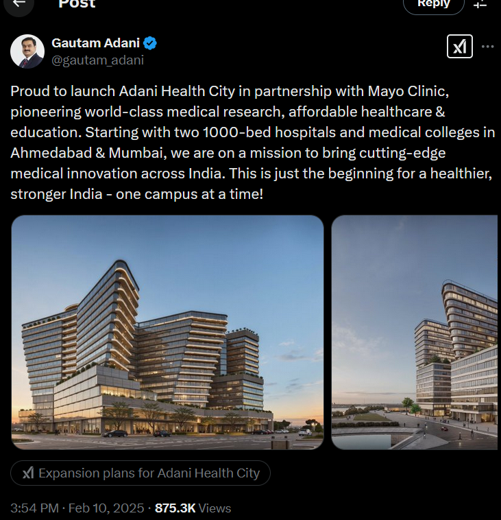 Adani Enterprises Ltd (NSE: ADANIENT) rose by 5% today, distinguishing itself in an otherwise sluggish market session. The rally occurred after the announcement that the Adani family committed ₹6,000 crore to establish two large, non-profit hospitals in India. The hospitals will be created in collaboration with Mayo Clinic Global Consulting as a component of the newly initiated Adani Health City project.