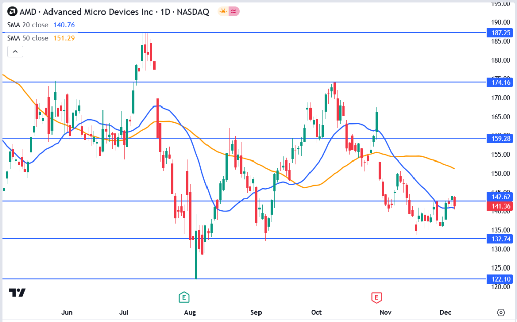 - $142.62: A key resistance level that AMD is testing. A clear breakout could trigger further gains.