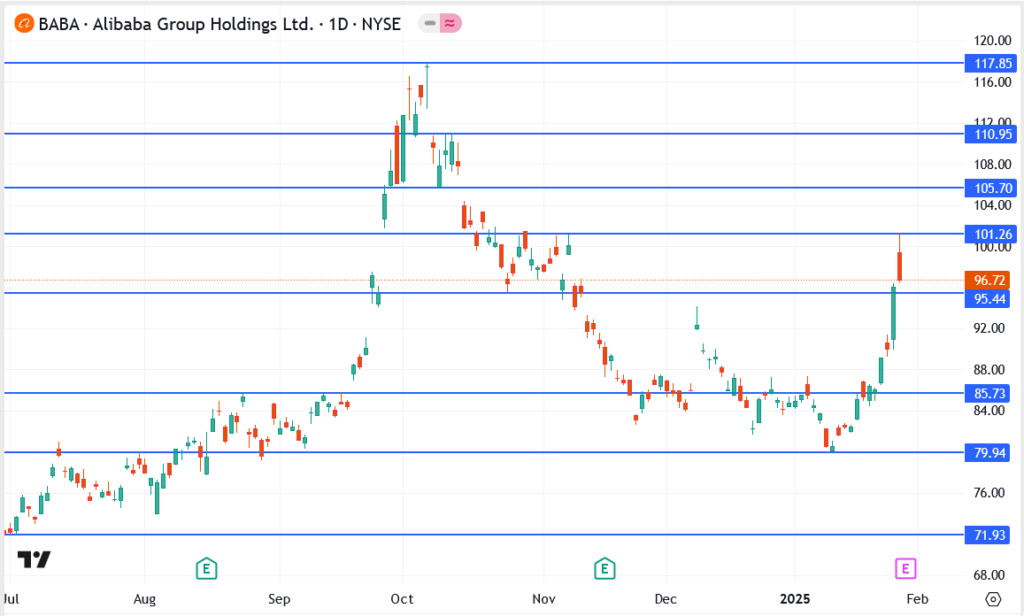 Alibaba’s stock reacted positively to the news, jumping past $96.72 as investors welcomed the company’s renewed focus on AI. The rally pushed BABA past the key $95.44 resistance level, suggesting growing optimism among traders.