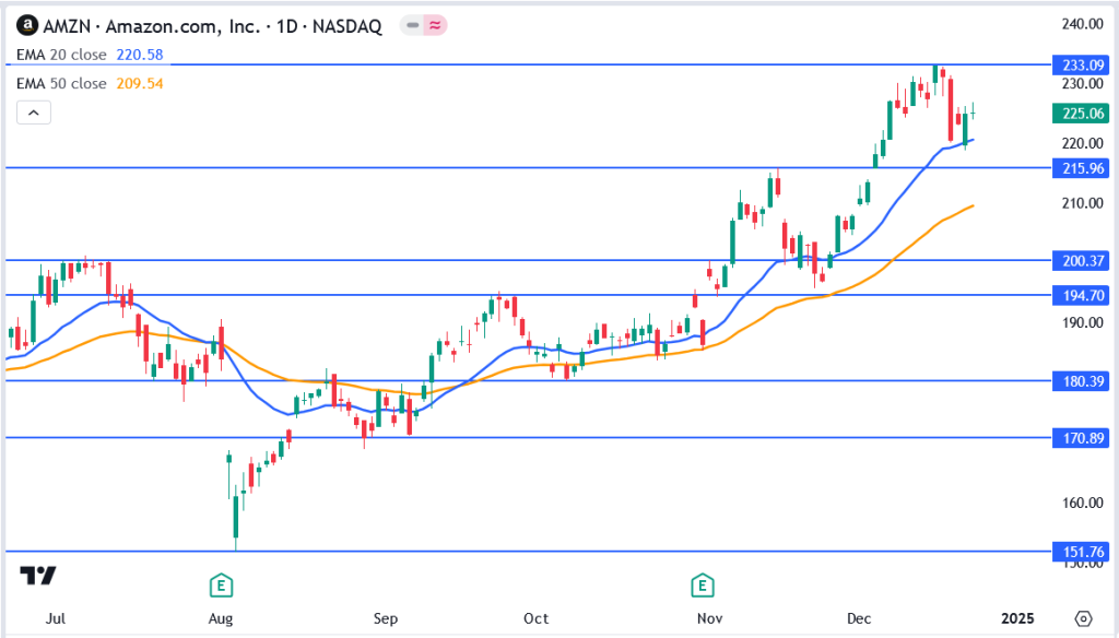 Amazon.com Inc. (NASDAQ: AMZN) continues to shine this holiday season, with shares trading at $225.06 as of December 24, 2024. The retail and cloud giant has maintained its position as a market leader, capturing attention with strong holiday sales and the consistent growth of its Amazon Web Services (AWS) division. After being named a top pick for 2025 by analysts, Amazon remains a stock to watch as the year ends.