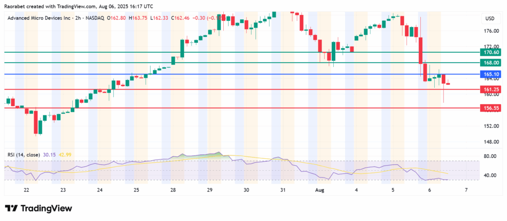 The momentum on AMD stock price calls for further downside if action stays below $165.10. Initial support will likely be at $161.25. However, if the sellers extend their control, the stock will break below that level and could test $156.55 in extension.