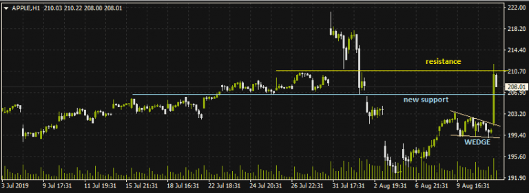 The stock was lodged in a falling wedge consolidation pattern, after having recovered some ground that was lost when President Trump announced new tariffs a few weeks ago. This latest news gave the stock the impetus needed to complete the pattern with a bullish breakout. Price hit the 210.10 resistance level and is experiencing a pullback. The new support formed by the late July lows at 206.70 may be a possible dip buying area.