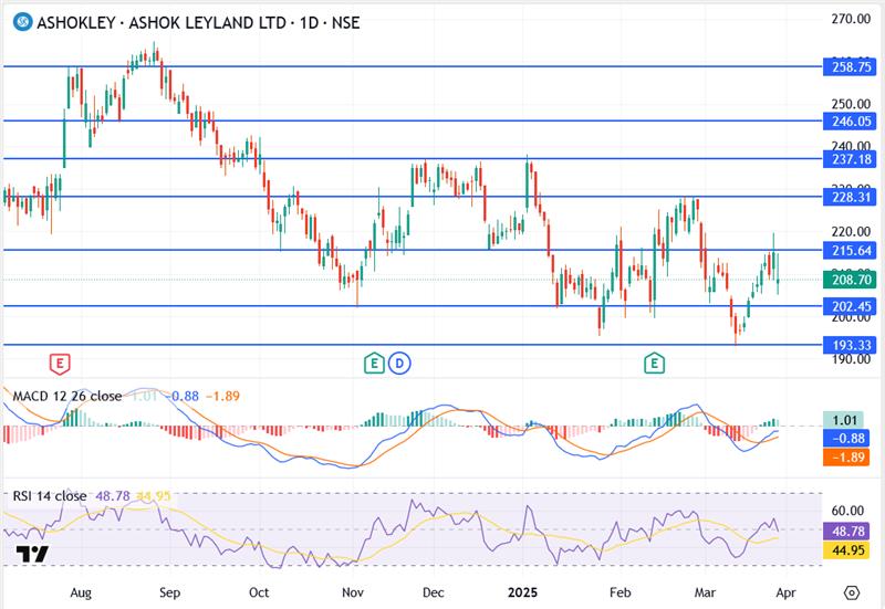 Ashok Leyland share price crashing 5% after its Switch Mobility UK exit has triggered short-term panic, but key indicators like MACD and RSI suggest a potential reversal is forming. A breakout above ₹215.64 could open the path toward ₹228–₹237, while a breakdown below ₹202.45 risks retesting ₹193.