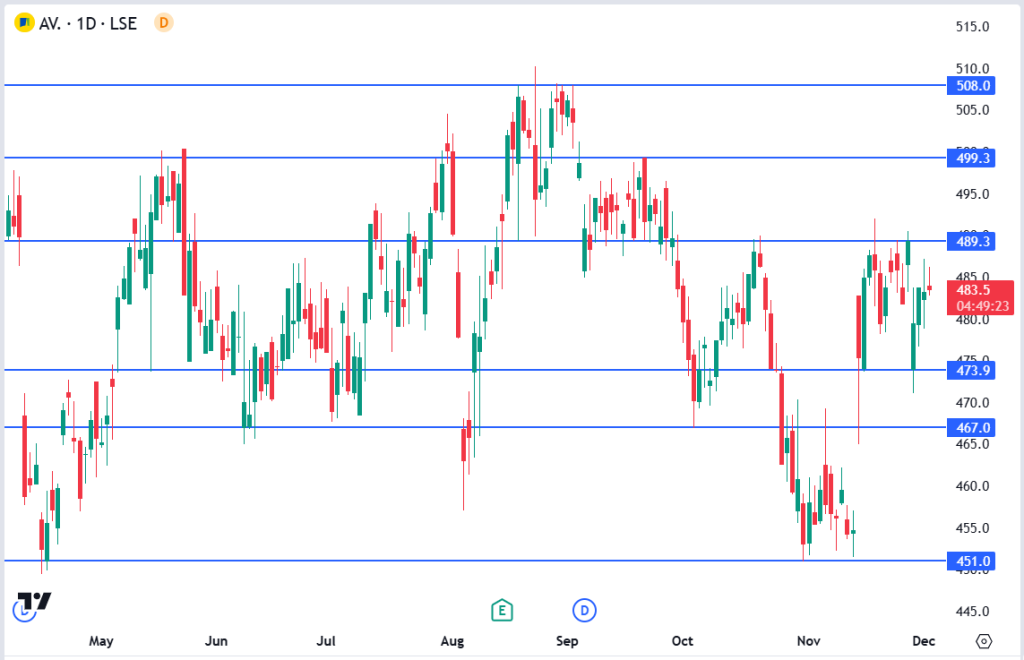 Aviva’s stock has been trading in a tight range, testing both support and resistance levels. Here’s what the charts indicate: