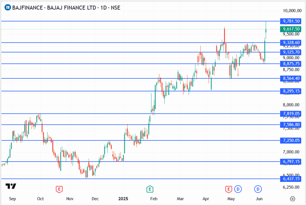 The rally intensified on Monday after Bajaj Finance announced a 1:2 stock split and a 4:1 bonus issue, sending the stock to a fresh 52-week high of ₹9,785.90. As of 2:47 PM IST, shares were up over 2.7% on the BSE, trading at ₹9,626, with bulls clearly in control.
