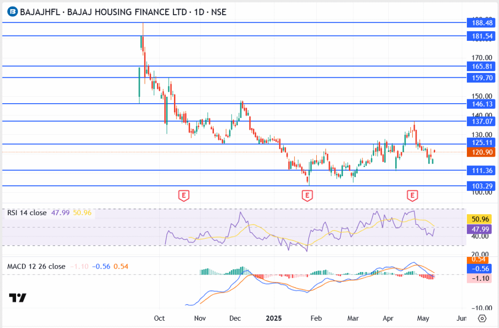 Bajaj Housing Finance is quietly making a move. After bouncing off support around ₹111 in April, the stock has pushed back above ₹120 and is now inching toward a critical inflexion point. With broader financial stocks struggling to find direction, Bajaj’s price action stands out, not for a massive rally, but for how well it’s holding its ground.