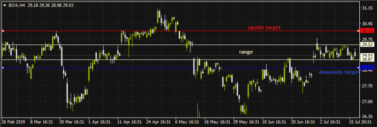 After opening with an upside gap of 20 cents, the stock has started to retreat towards the floor price of the range identified in the chart below. This brief selloff may be as a result of concerns about the impact of future rate cuts on the bank’s revenue base, seeing that its investment division is not performing well and a lot of its profit comes from interest earned on loans.