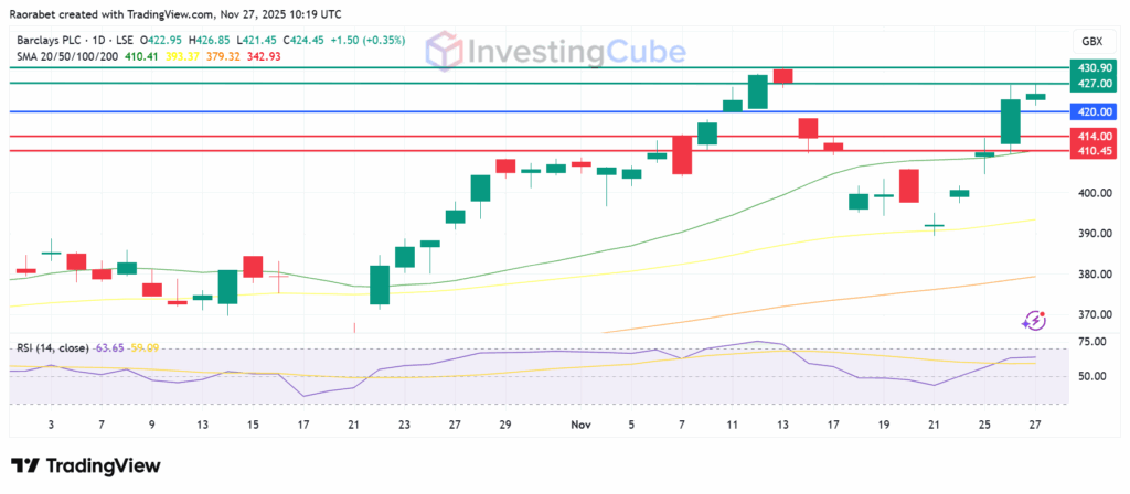 BARC share price on November 27, 2025 with key support and resistance levels. Created on TradingView