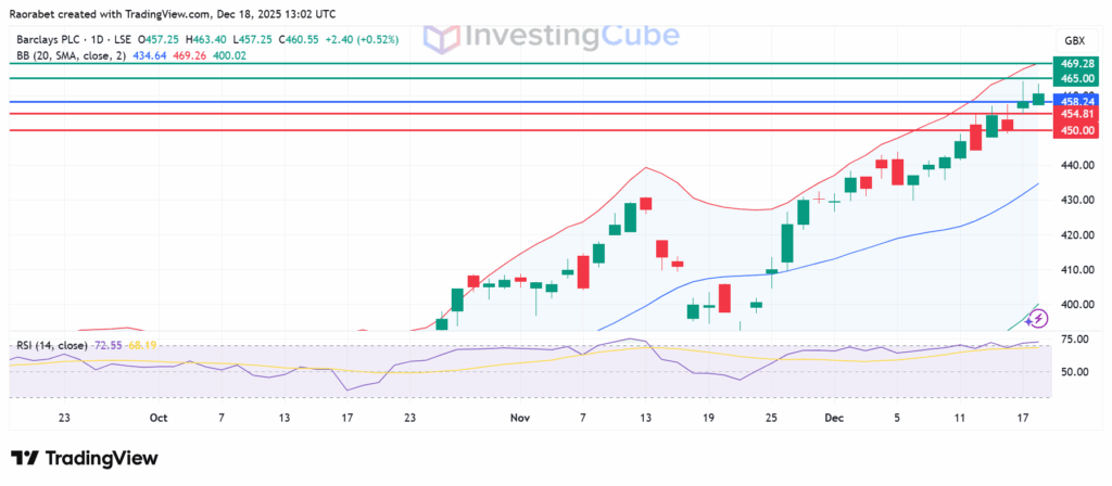 Barclays share price is still going strong. Momentum indicators point to continued buying interest, with the Relative Strength Index at 72.55, showing positive conditions but within overbought territory. Primary resistance is at 465p, beyond which a stronger momentum could test the upper Bollinger Band at 469.28. Key support levels are at 450-454p zone.