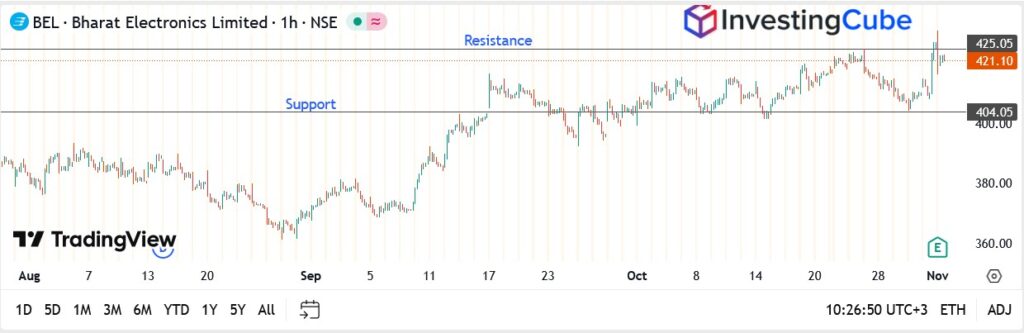 Bharat Electronics Ltd (NSE: BEL) started the week on a steady note, hovering near ₹421 after last week’s 4% rally. The stock remains comfortably above its key support level of ₹404, signaling sustained institutional buying interest as India’s defence sector continues to attract fresh inflows. The recent uptrend reflects confidence in BEL’s long-term order pipeline and its growing role in the government’s indigenisation push.