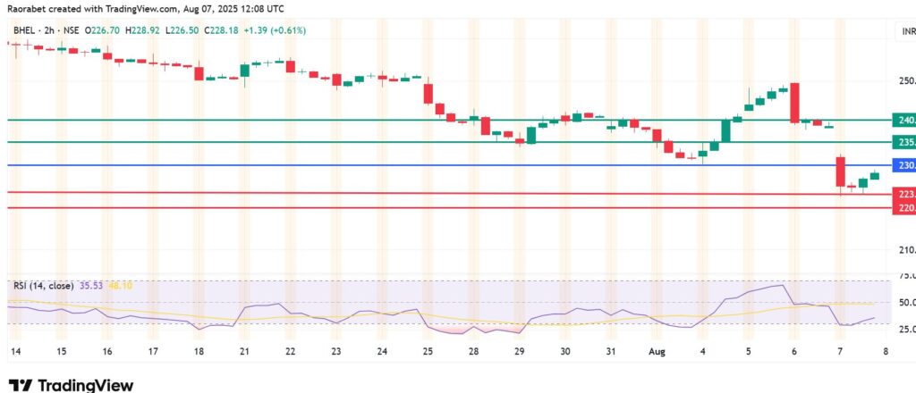 BHEL share price has its pivot at ₹230 and action below that level favours the sellers to be in control. That will likely see the first support established at ₹223. However, an extended control by the sellers will break below that level and potentially test ₹220.