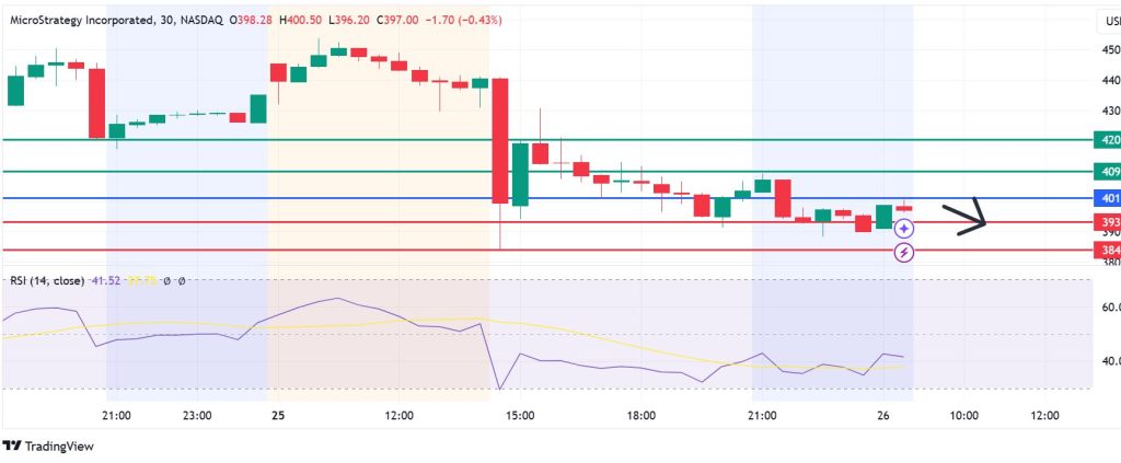 MicroStrategy price pivots at $401, and the upside will prevail if the price action stays above that mark. With the buyers in control, the first barrier is likely to be at $409. However, a stronger momentum will break above that level and potentially test $420.