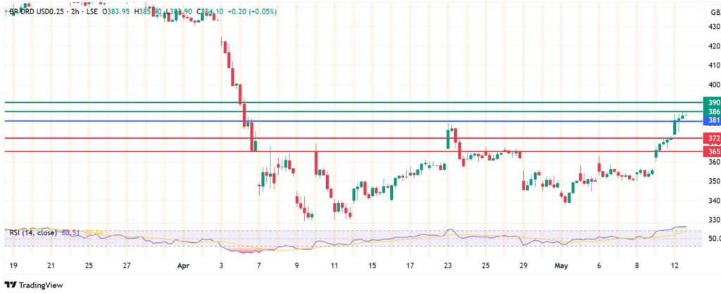 BP stock price pivots at GBX 381 and the momentum favours action to stay above that level. With the buyers in control, the stock will likely edge up to meet the first resistance at GBX 386. A stronger momentum will break above that level and potentially take the action higher to test GBP 390.