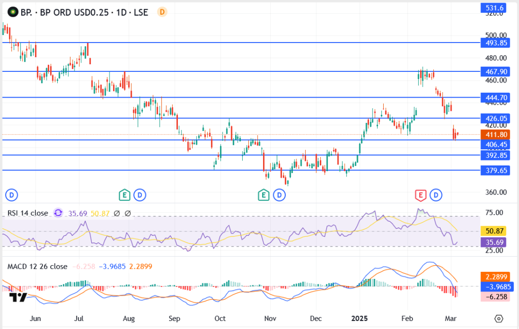 BP Plc (LSE: BP) has seen a pullback in its share price, dropping to £411.80 amid broader market volatility and profit-taking after recent highs. The stock, which reached a peak near £467.90, has struggled to hold gains and is now testing key support levels. Investors are closely watching whether BP can stabilize or face further downside risks.