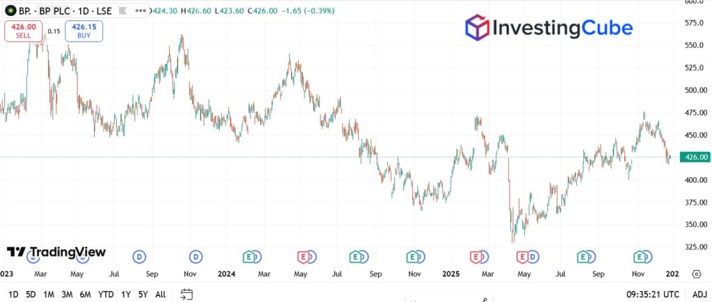 - BP shares trade near 426p as investors assess CEO changes, buybacks, and oil price trends, with the stock range-bound heading into 2026.