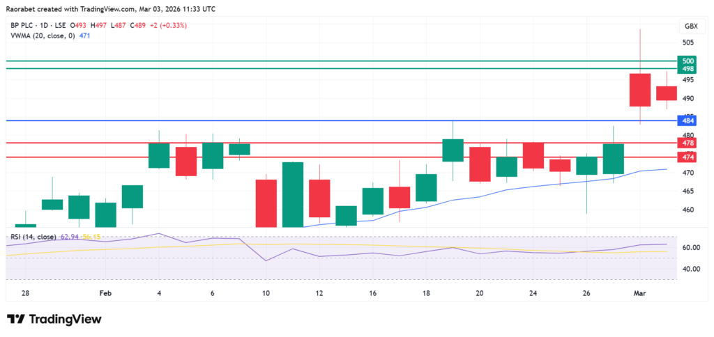 BP stock price is on a bullish run, as shown by action above the Volume Weighted Moving Average (VWMA) and its RSI at 62.91. It will likely encounter initial resistance at 498p, beyond which it will target the psychological 500p level. If the buyers manage to convert that level into a support, the next target will be at 510p.
