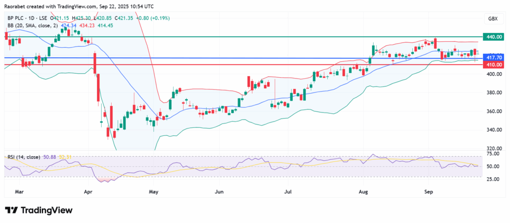 The stock is currently below the middle Bollinger Band, with the daily RSI at 50.88 signaling neutral-bearish conditions. Support is currently at 417.70p and a break below that level could decisively shift the momentum to the downside. Meanwhile, the second support lies at 410p while medium-term resistance is at 400p.