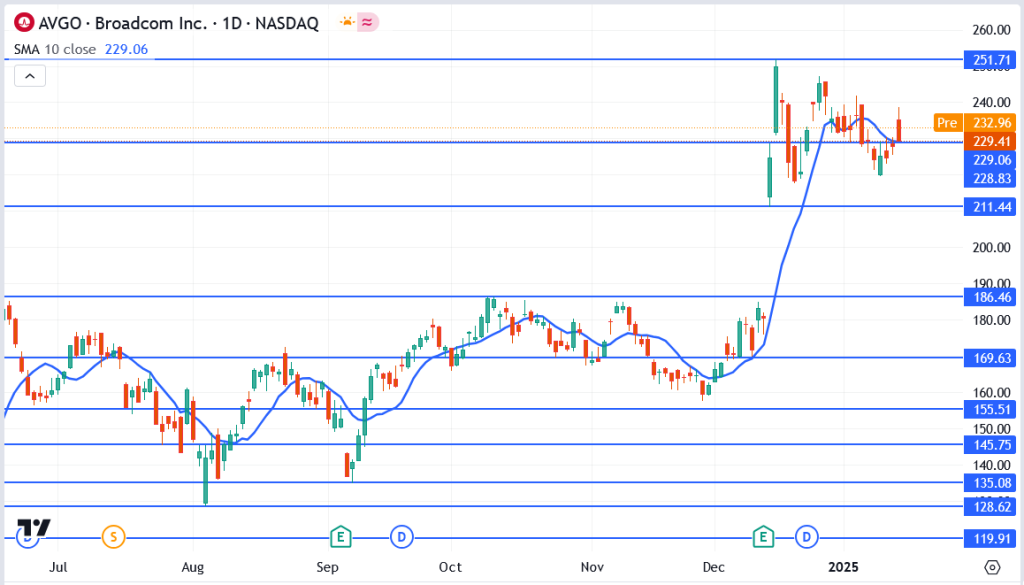 Broadcom’s ability to stay above $229.06 reinforces the bullish sentiment, with $240 acting as the next critical hurdle for traders to watch.
