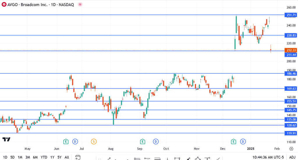 Broadcom’s drop today reflects the broader market mood rather than specific weakness. With key support levels being tested and long-term growth drivers intact, the current selloff may open opportunities for patient investors. However, navigating market volatility will require careful attention to both company performance and macroeconomic trends.